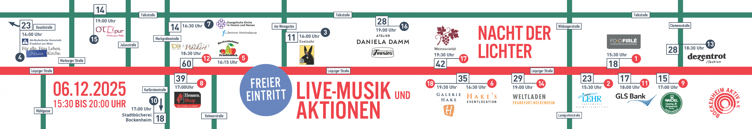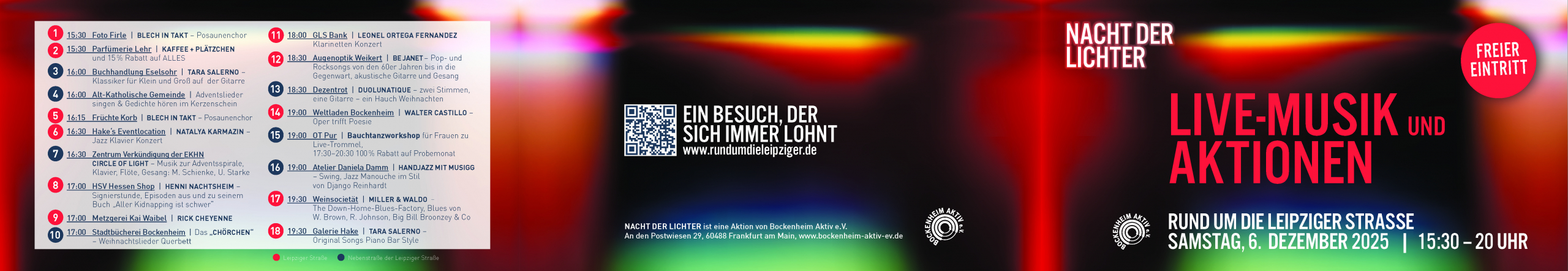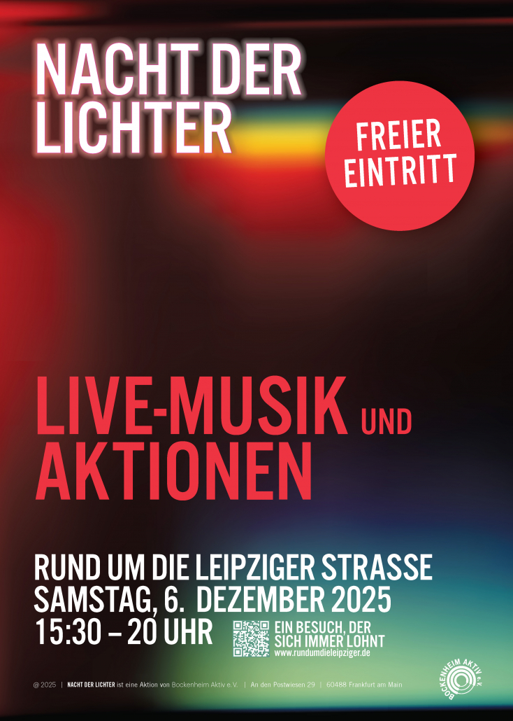 Am Samstag, den 6. Dezember 2025, wird die Leipziger Straße erneut zur Bühne für eines der schönsten Stadtteilfeste in Bockenheim: die Nacht der Lichter. Zwischen 15:30 und 20:00 Uhr erwartet die Besucherinnen und Besucher ein stimmungsvoller Abend mit warmem Licht, Live-Musik und vielfältigen Aktionen in den teilnehmenden Geschäften.